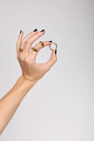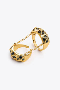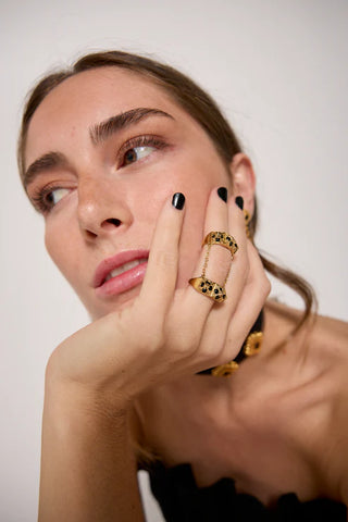 Hasta ahora, el anillo más sofisticado e innovador que hemos diseñado hasta la fecha. Dos anillos unidos entre sí por dos cadenas, de latón bañado en oro de 24 kt. Cada anillo está compuesto por doce circonitas negras engarzadas en una estructura con detalles hechos a mano de manera artesanal. Se aconseja evitar el contacto con perfumes, cremas, jabones y agua. Para conservar el brillo de la pieza te recomendamos limpiarla usando el paño suave que incluimos junto con la pieza.