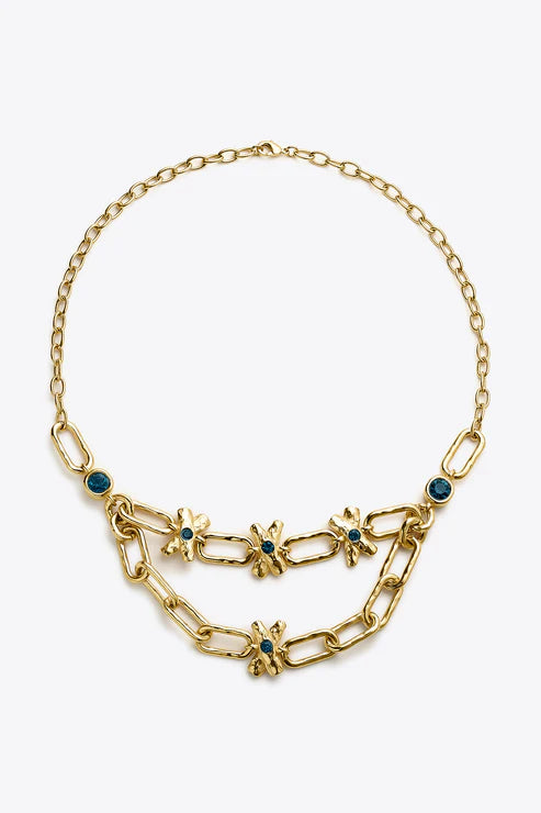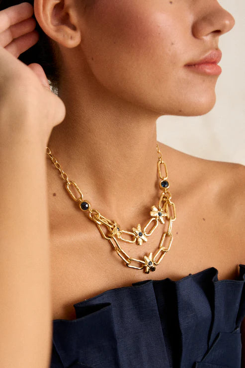 Este collar de doble cadena combina fuerza y delicadeza en una composición que evoca lo natural con un giro contemporáneo. Una pieza escultural, perfecta para destacar en ocasiones especiales o transformar un look cotidiano en algo extraordinario.