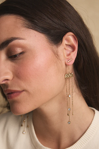 La versión más sutil de Le Château, con su versión de cierre discreto multiposición, perfecto como pendiente principal en la posición que más te guste e, incluso, como piercing. Además, su diseño te permite añadir tres cadenas colgantes que suman personalidad por su composición de formas en textura marteléy cristales blancos.