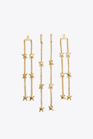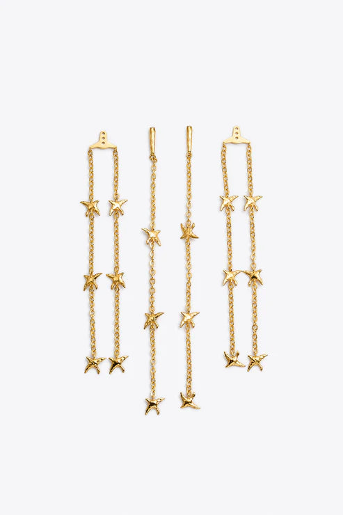 Estos pendientes se caracterizan por su diseño multiposición, que permite crear desde un look más llamativo y rompedor con las 3 cadenas colgantes a uno más sencillo y sutil, luciendo únicamente una de las cadenas. Además de por su versatilidad, también destacan por su longitud y la originalidad del efecto martelé de los pájaros.