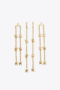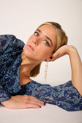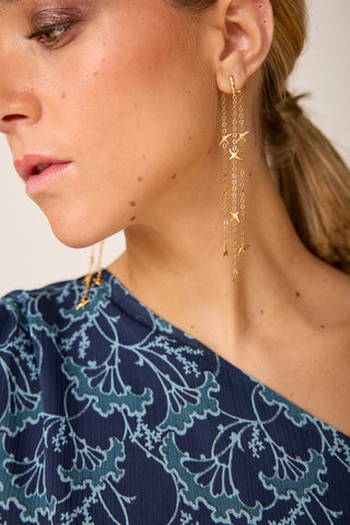 Compuestos por pájaros a largo de una cadena. Están fabricados en latón bañado en oro de 18 y 24 kt. La medida del pendiente es de 10 centímetros. Se aconseja evitar el contacto con perfumes, cremas, jabones y agua. Para conservar el brillo de la pieza te recomendamos limpiarla usando el paño suave que incluimos junto con la pieza.