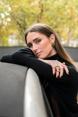 Pieza de latón bañada en oro de 24 kt, cuenta con cuatro circonitas negras en los bordes y un rombo esmaltado a mano. El efecto de la pieza central es martelé. Se aconseja evitar el contacto con perfumes, cremas, jabones y agua. Para conservar el brillo de la pieza te recomendamos limpiarla usando el paño
