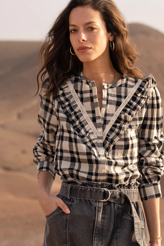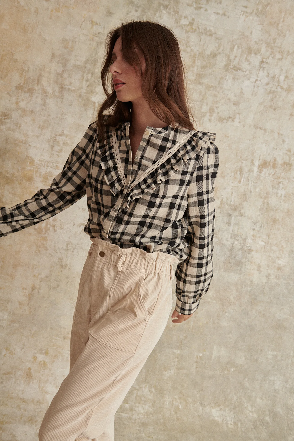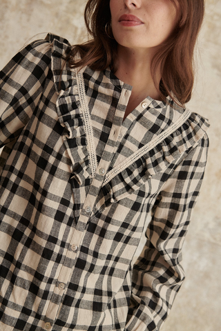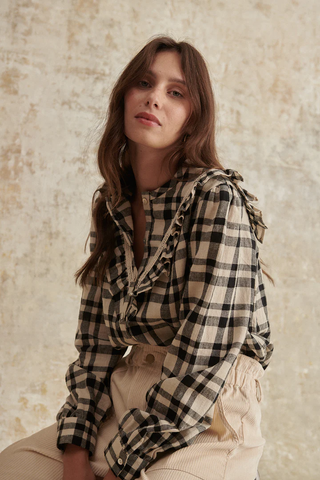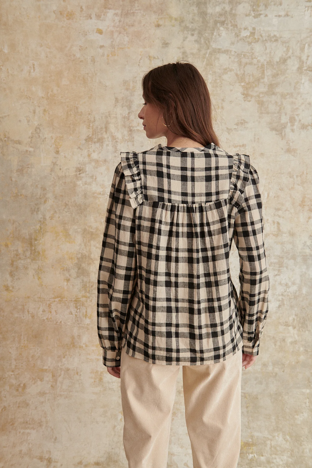 Camisa en suave franela de algodón de cuadros en contraste crema y negro con pequeño volante en la pechera y detalle bordado. Cuello mao, corte recto, mangas levemente abullonadas y puños marcados.