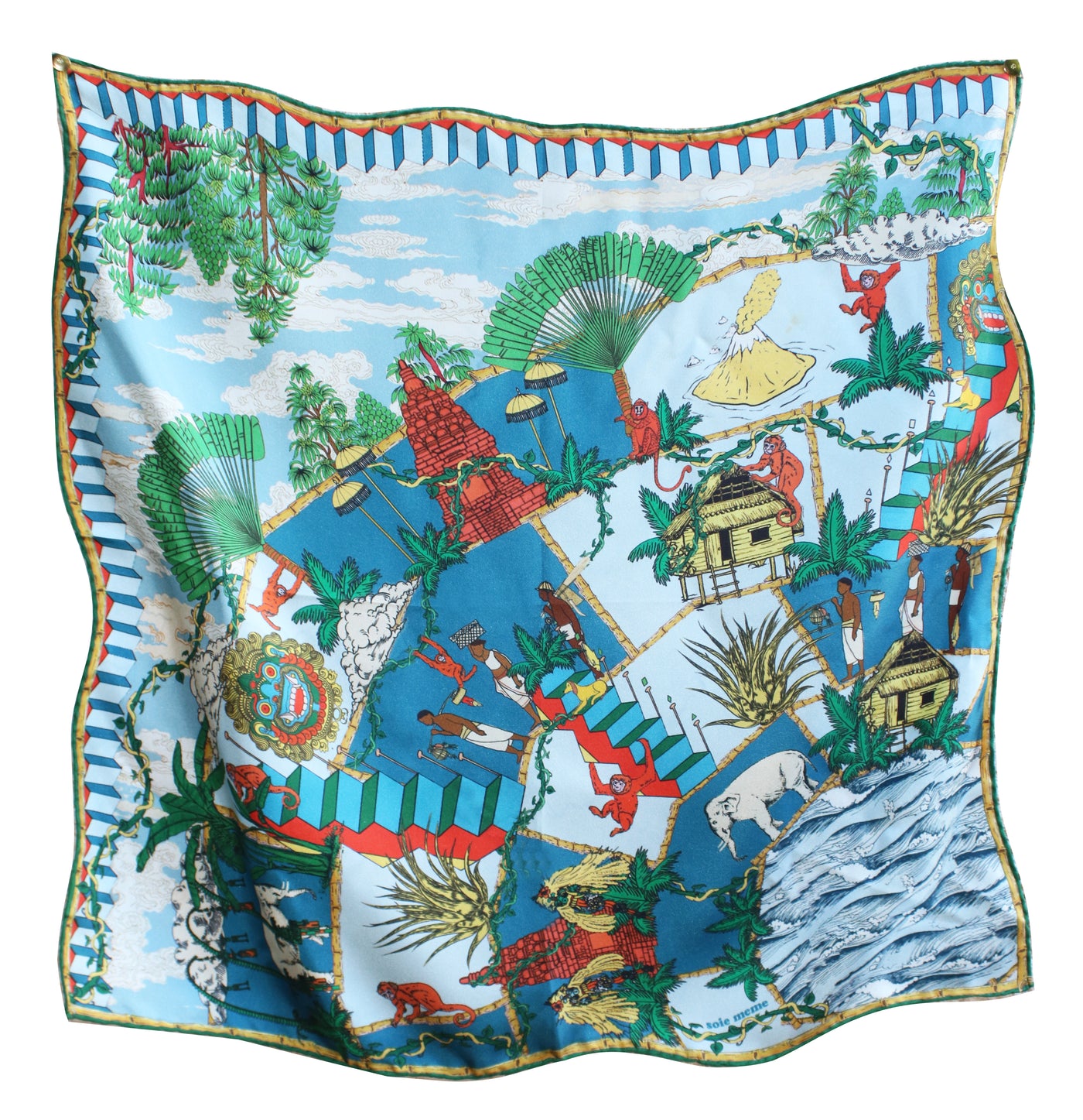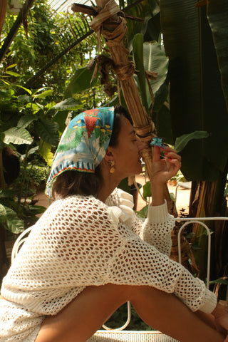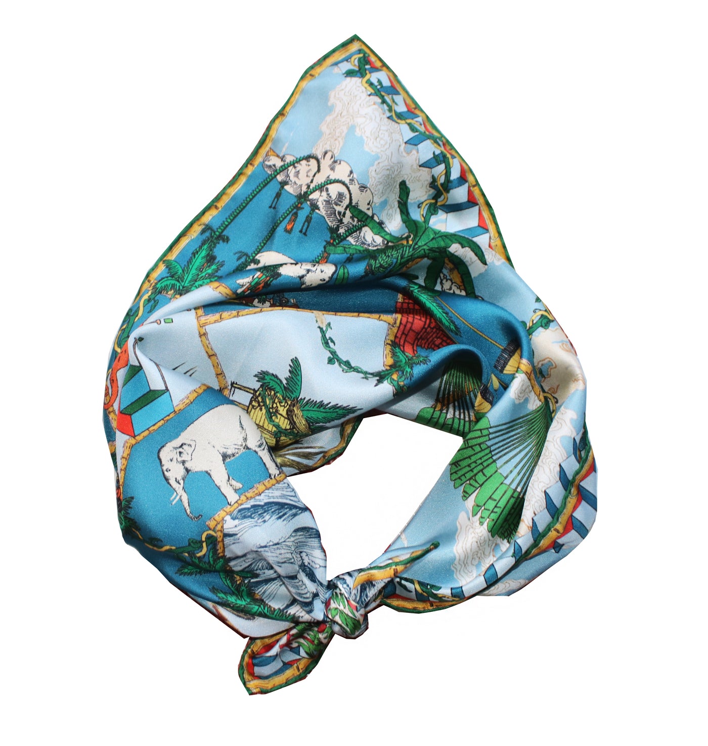 Pañuelo de seda diseñado en Francia y transferido digitalmente en pequeñas cantidades de forma ética en la ciudad natal de Acilay Meric en Turquía.