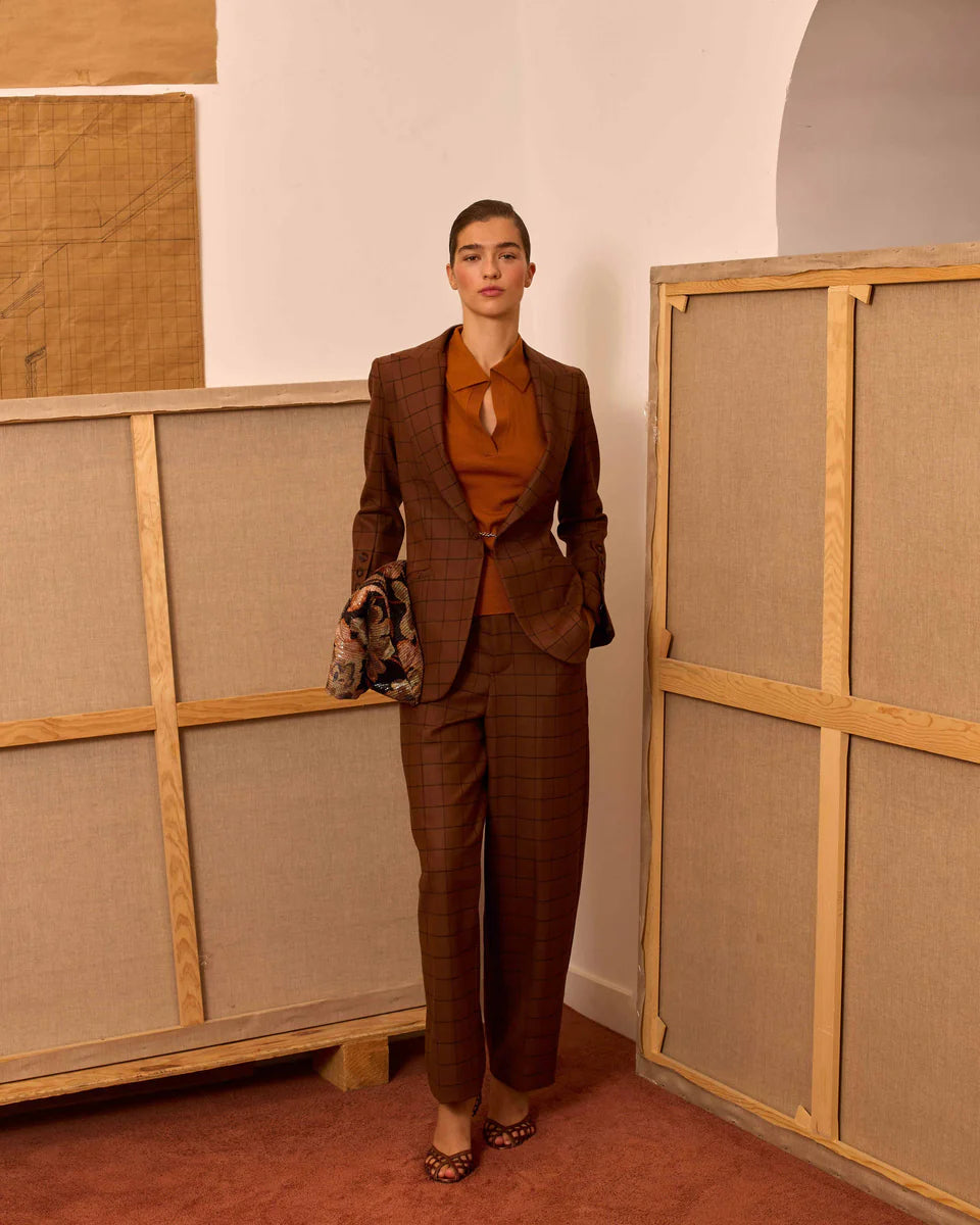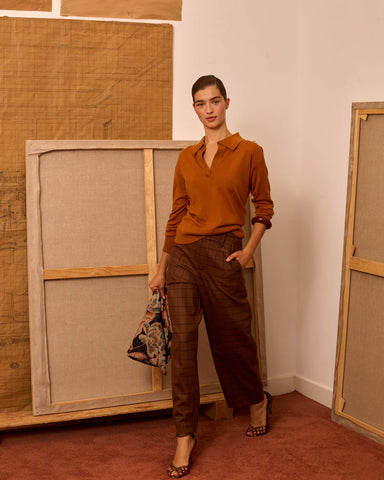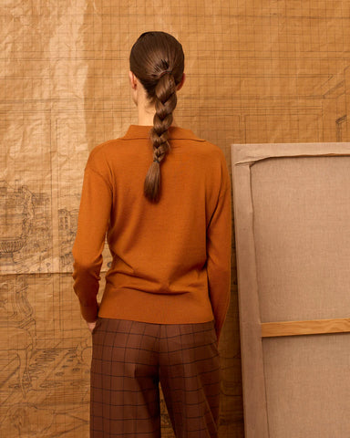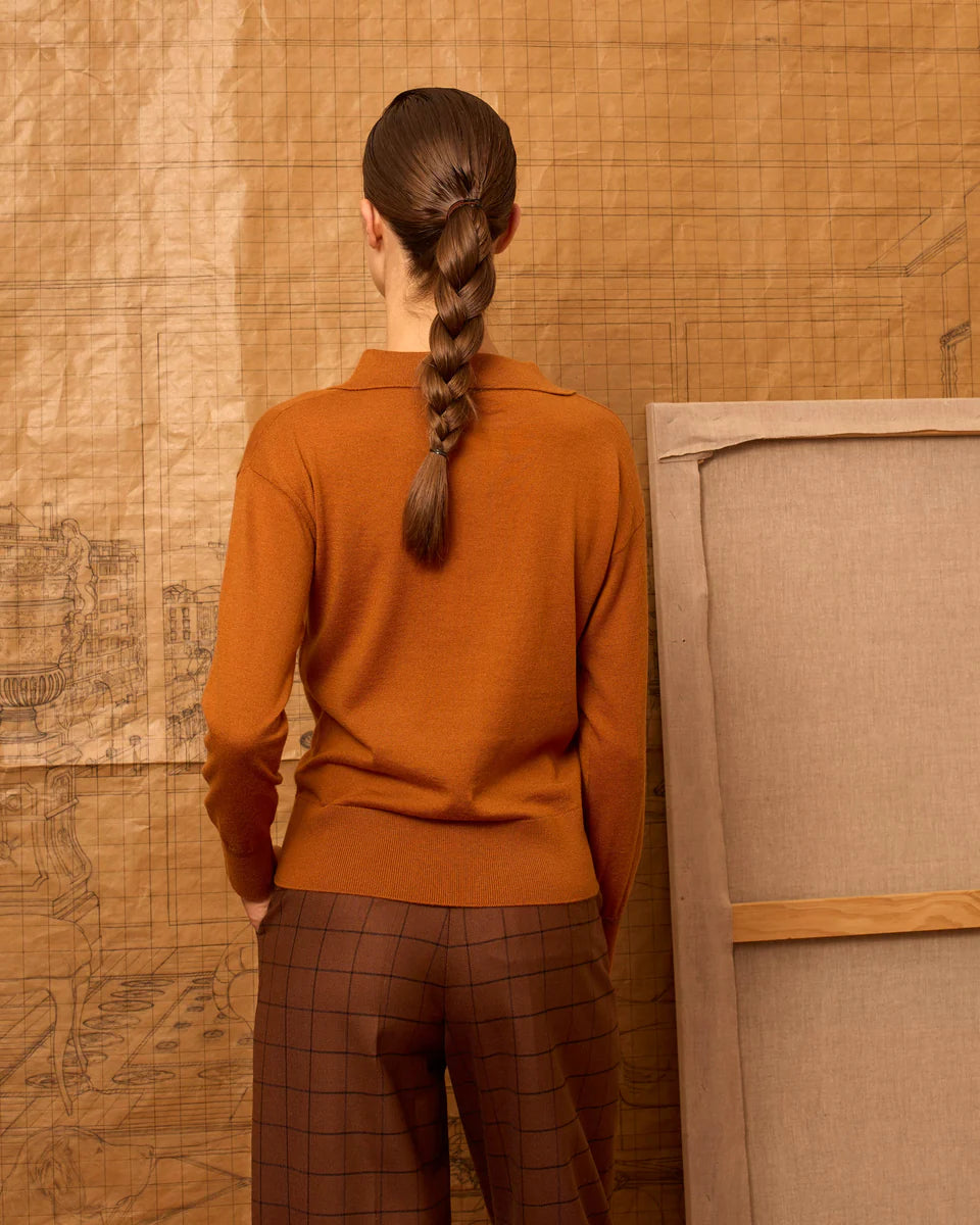 Jersey de punto con cuello solapa y manga larga en color naranja. Tiene detalle de lurex al tono en el inicio del puño