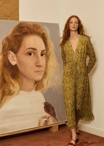 Vestido pájaros mostaza En oferta