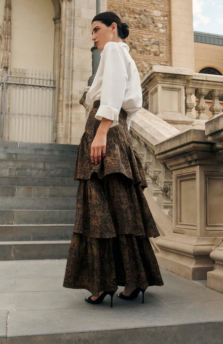 Falda Luisa, confeccionada en suave viscosa, destaca por sus elegantes volantes que aportan frescura y movimiento a tu estilo. Perfecta para cualquier ocasión, combínala con