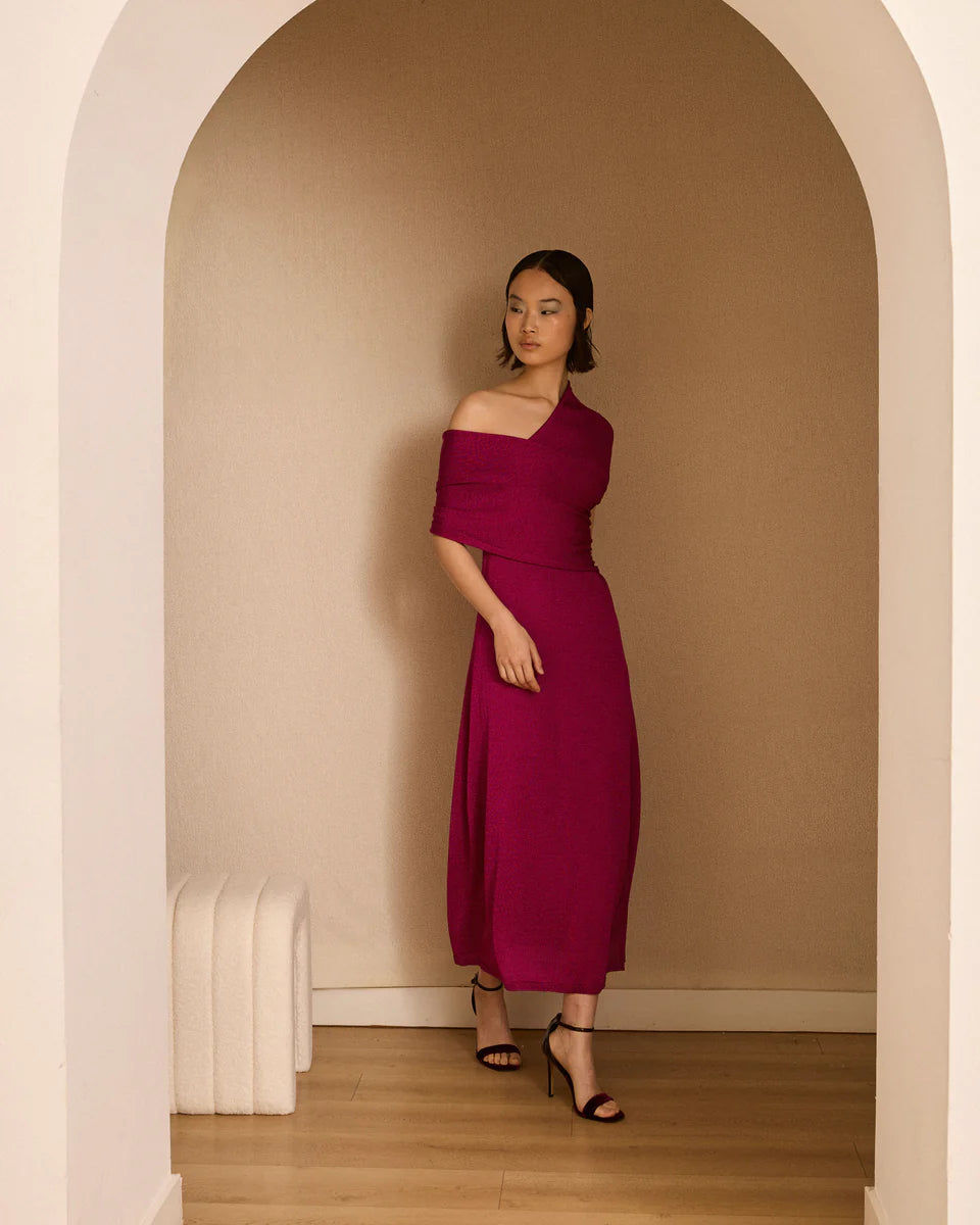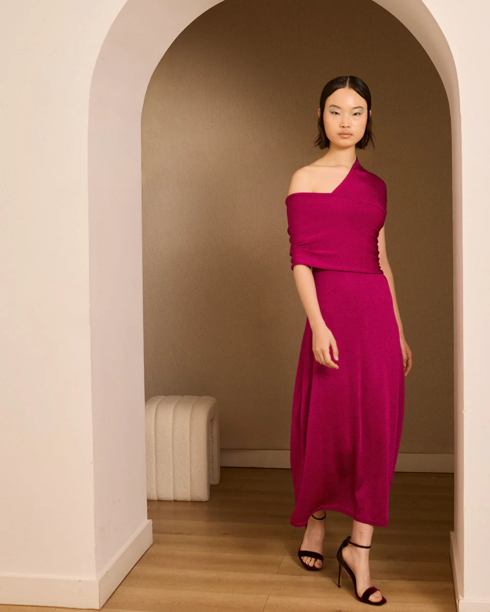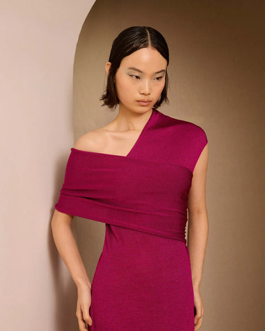 Vestido de lúrex fucsia con escote cruzado En oferta