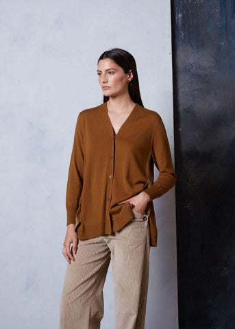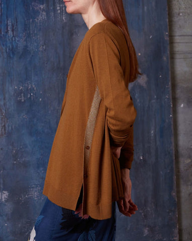 Chaqueta con detalles de lurex en los costados. Se ata mediante 5 botones. Tiene dos botones en el lateral izquierdo y dos ojales en la franja lurex del lado derecho que permiten abrocharla de nuevo en el centro, dando un efecto fruncido a la prenda.