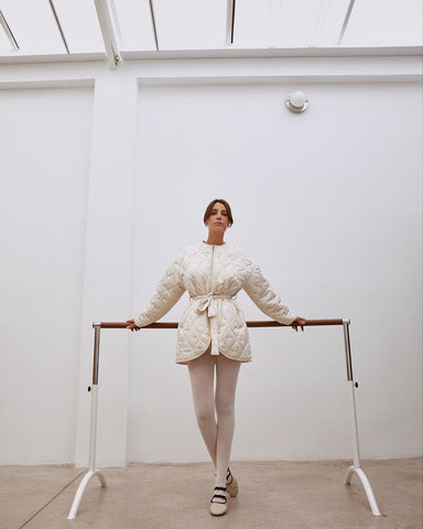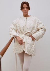 Esta chaqueta presenta adornos de cristales y perlas, junto con detalles metálicos como cremallera y botones en un suave color dorado. También incluye bolsillos laterales y un cinturón para ceñir la cintura.