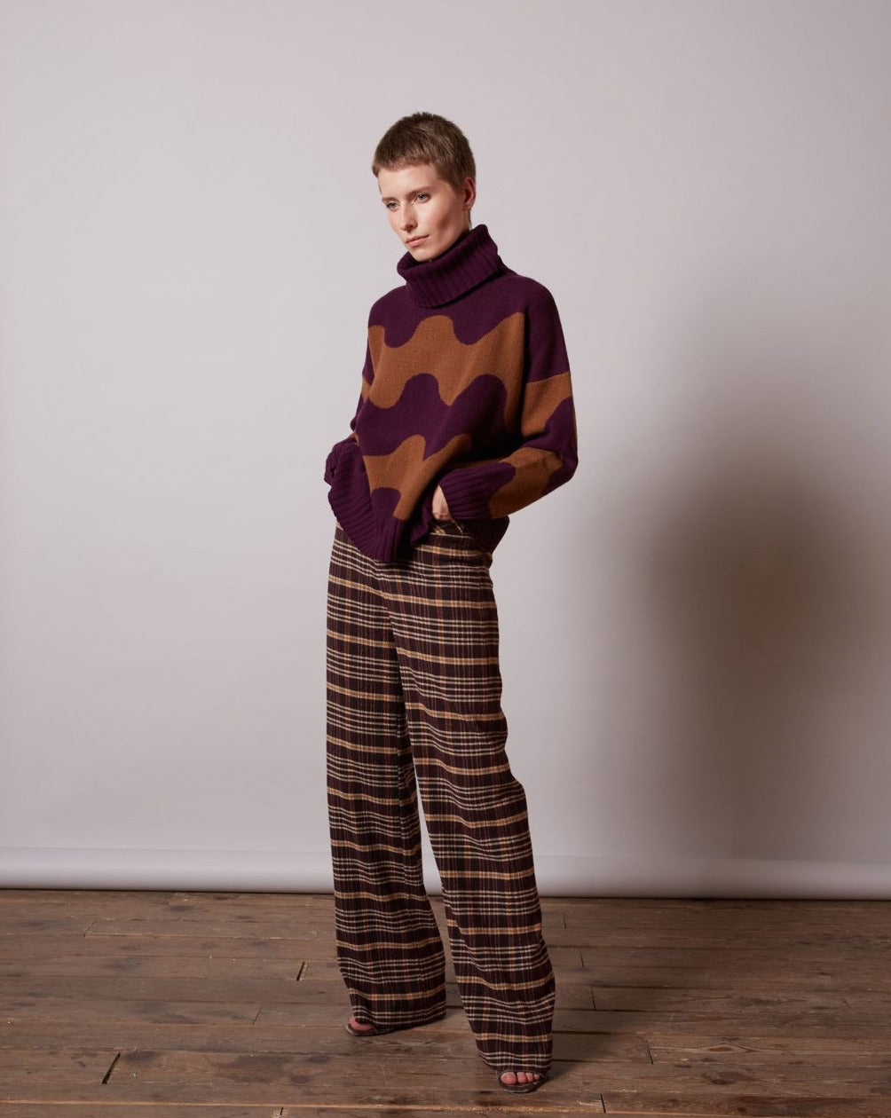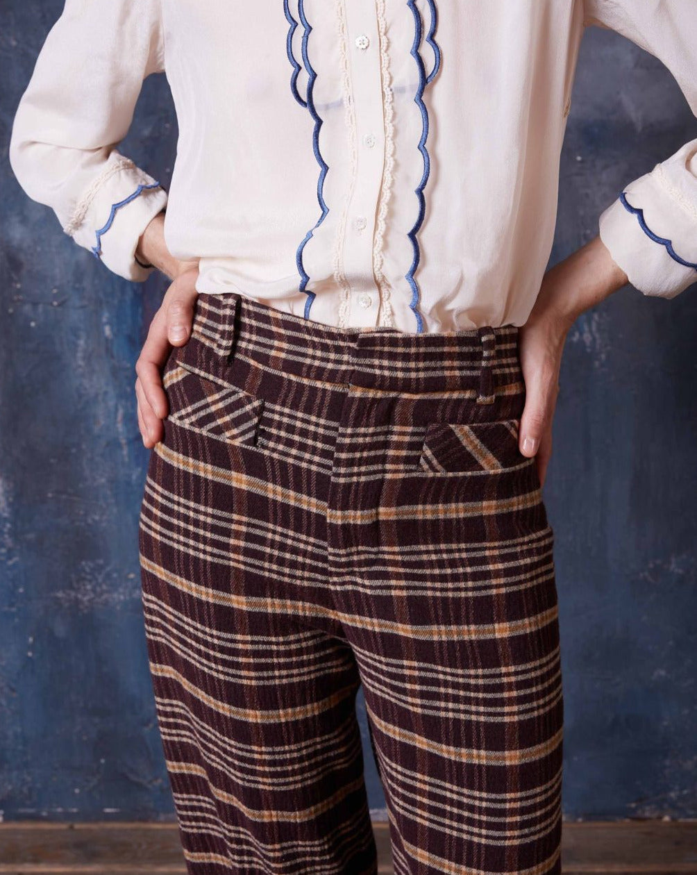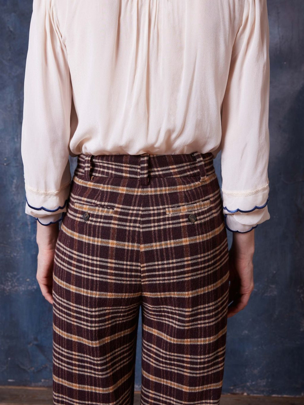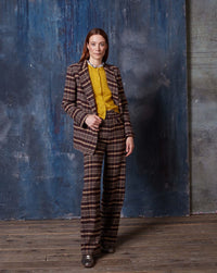 Pantalón cuadro pequeño Vestido cruzado o chaqueta abierta ocre