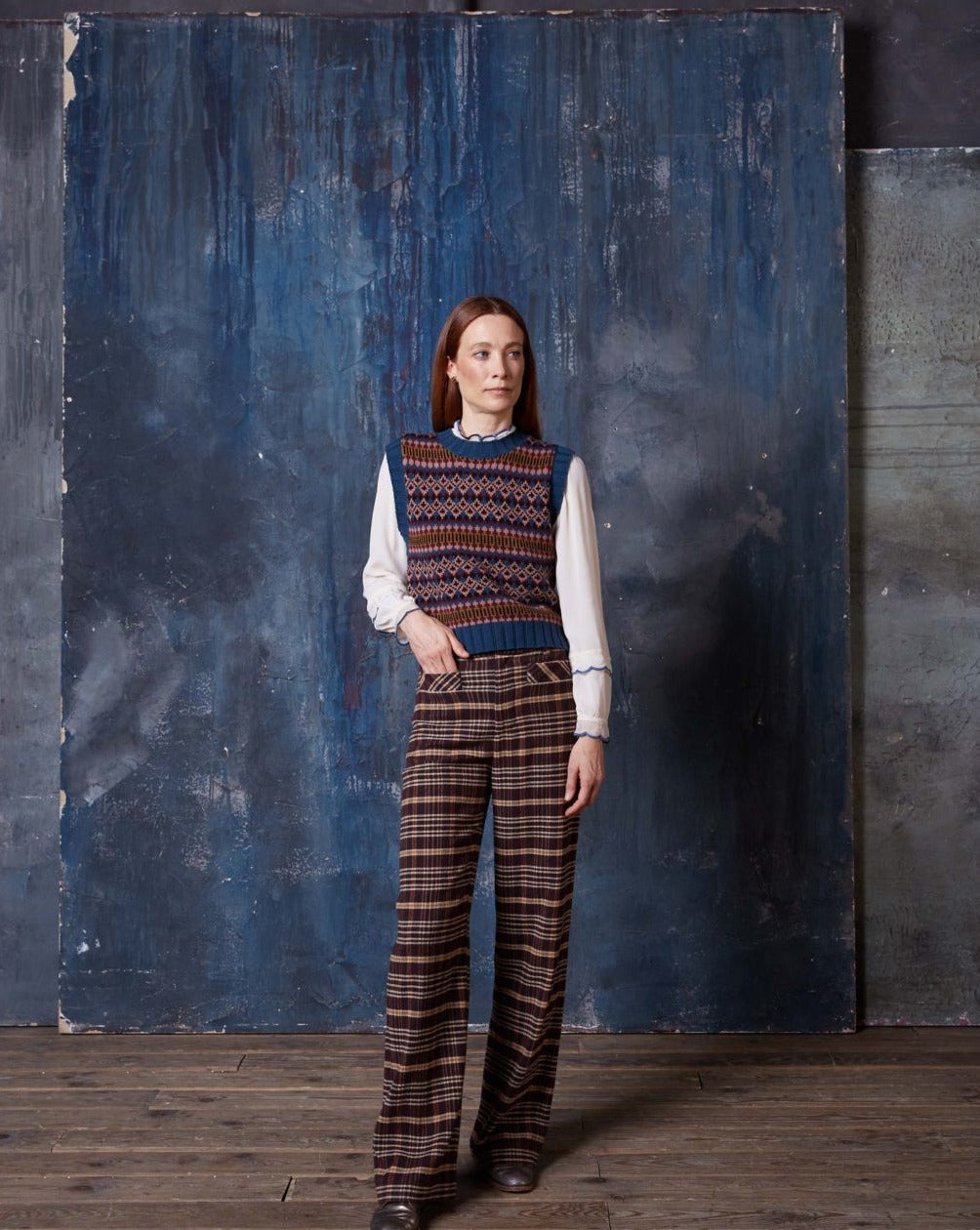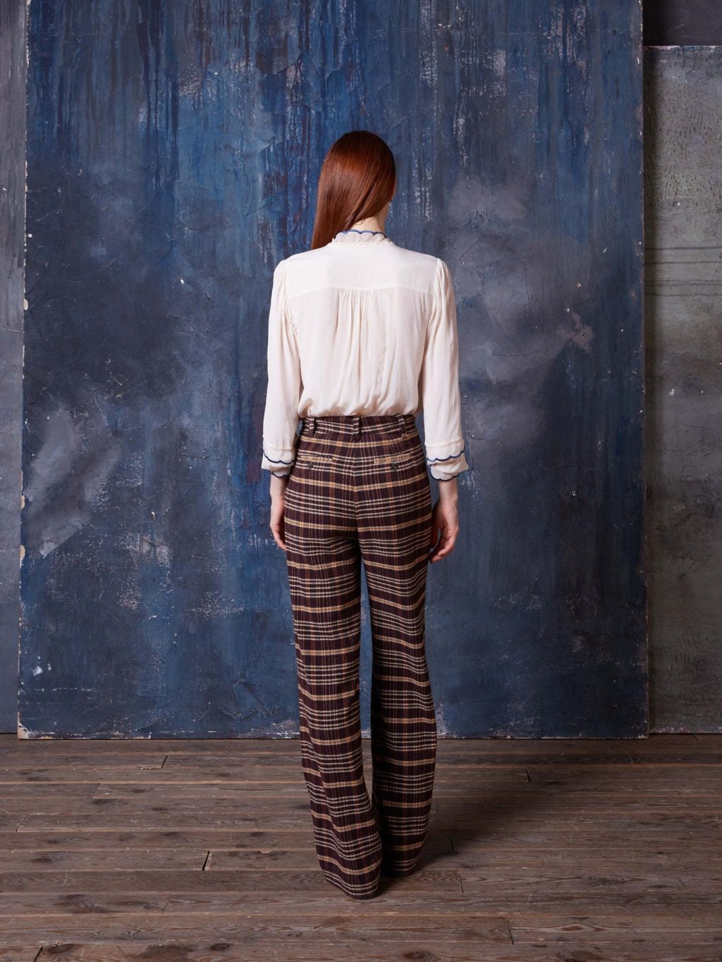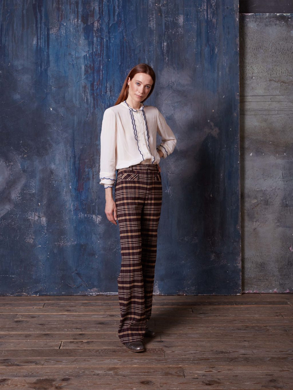Pantalón cuadro pequeño Vestido cruzado o chaqueta abierta ocre
