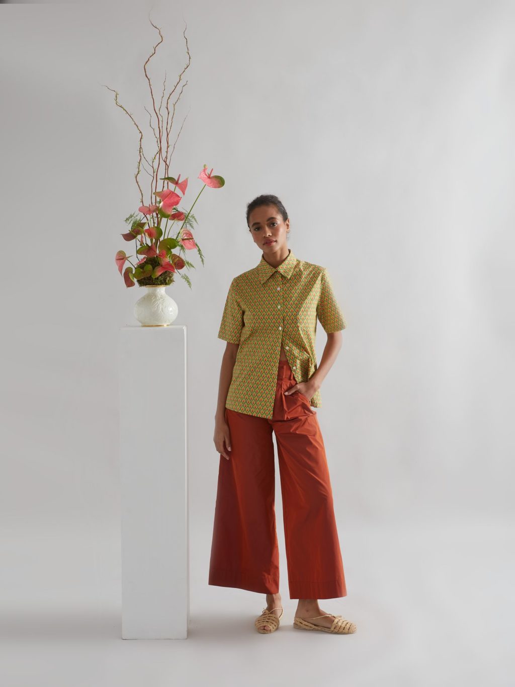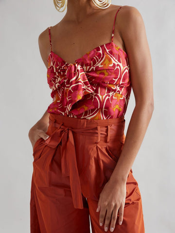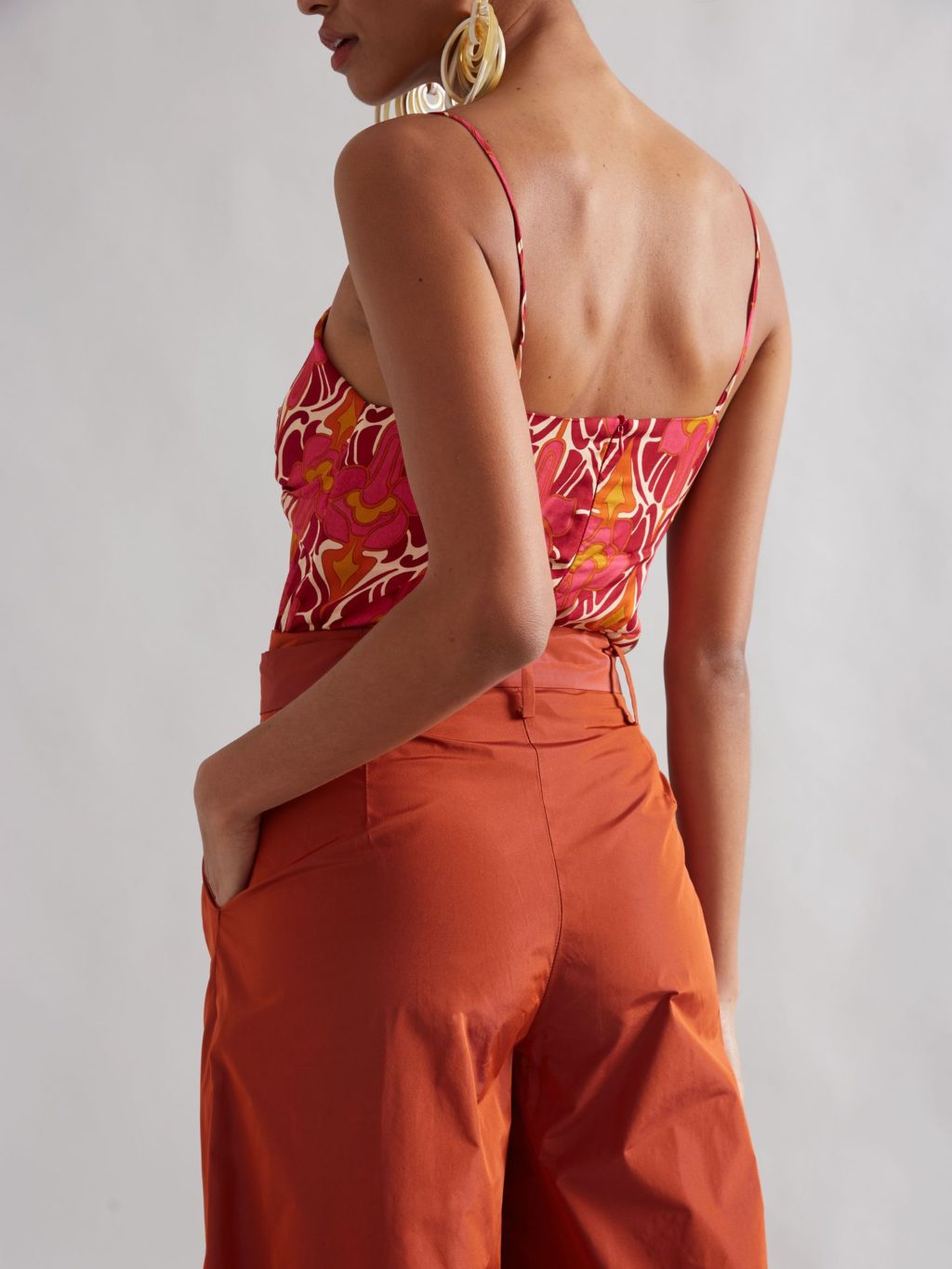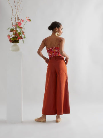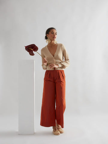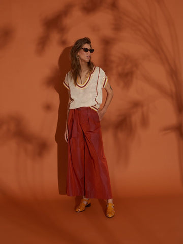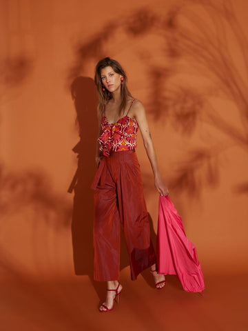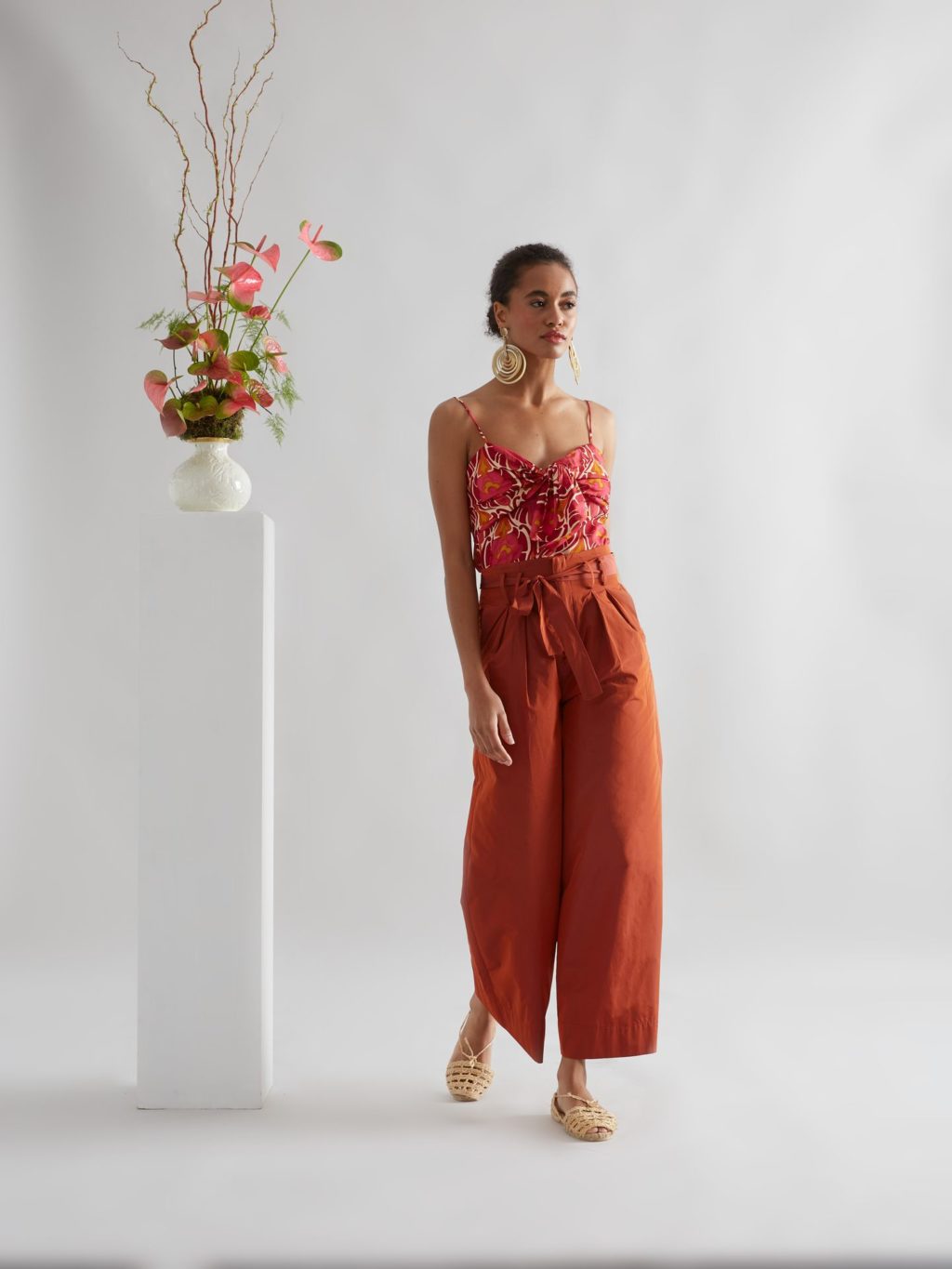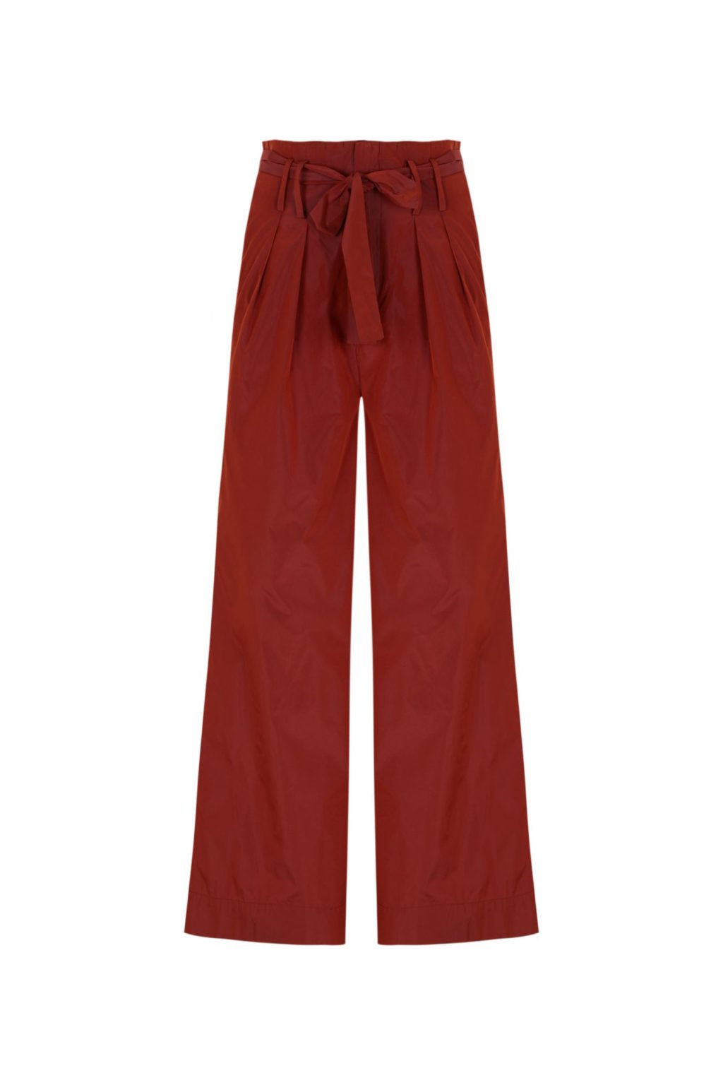 Pantalón Is coming de tafeta italiana color teja estilo cropped. Con trabillas y cinturón para anudar en la cintura.