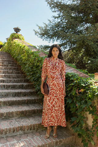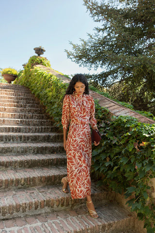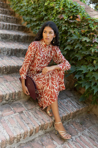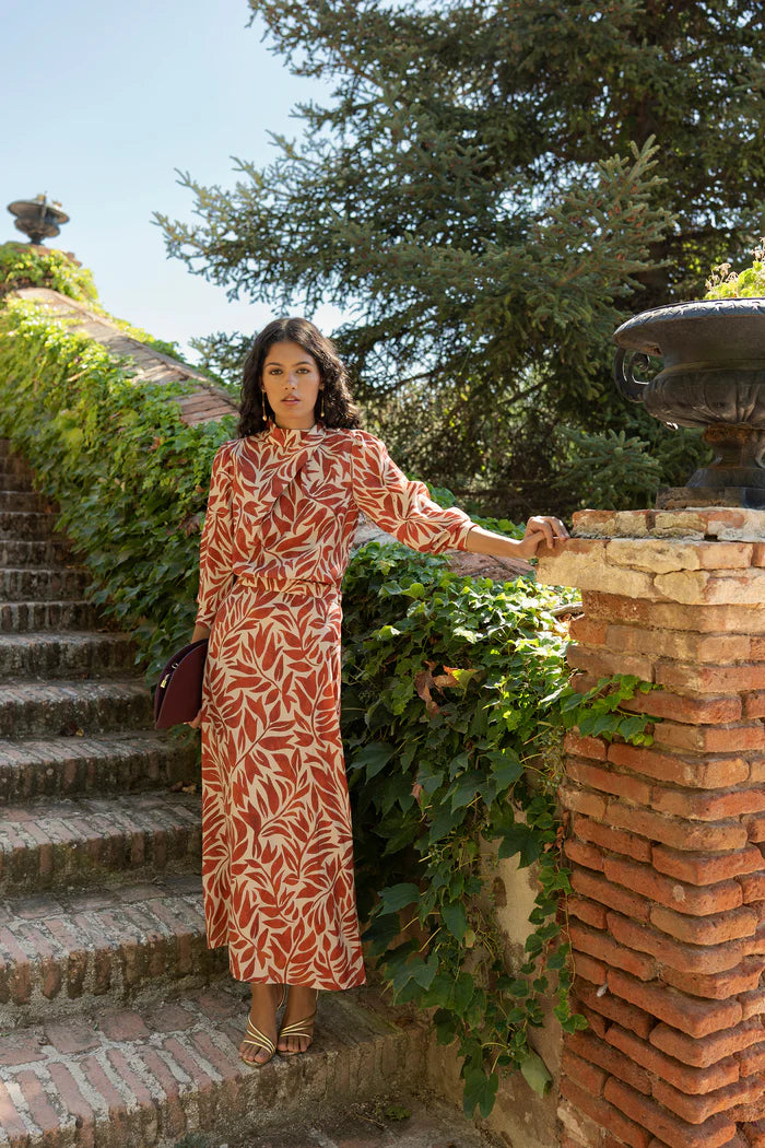 Falda midi en tejido estampado terracota y beige. Cierre con cremallera trasera.