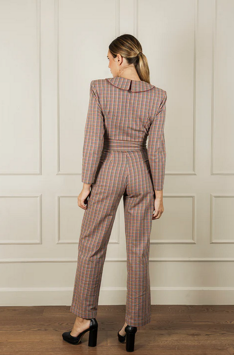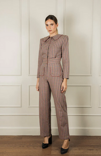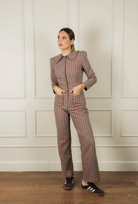 Mono de manga larga confeccionado en algodón con cuadros en burdeos y beige. Cuenta con cuello y bolsillos con vivo a contraste, cierre delantero abotonado y pernera recta. 100% Algodón
