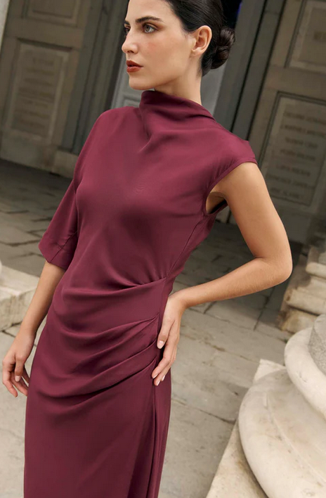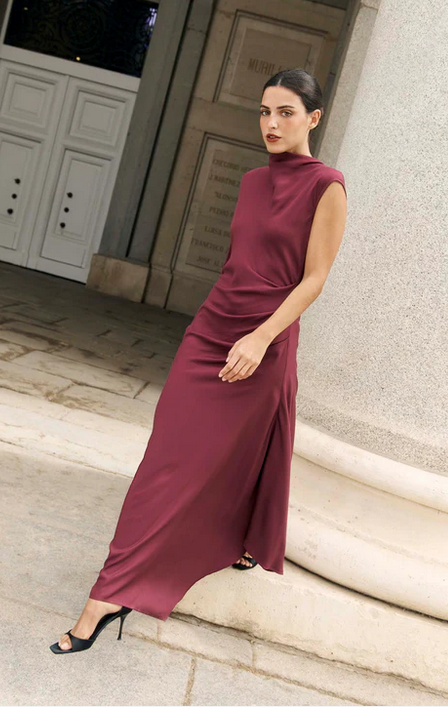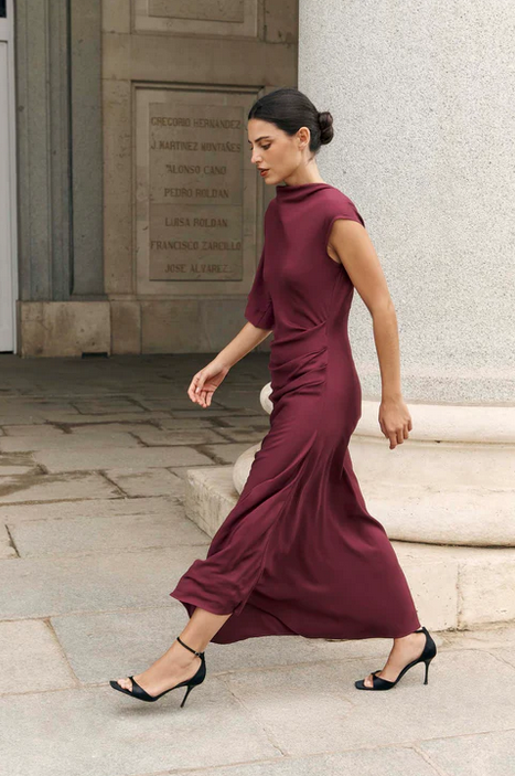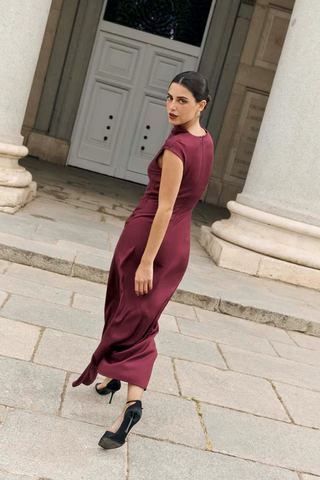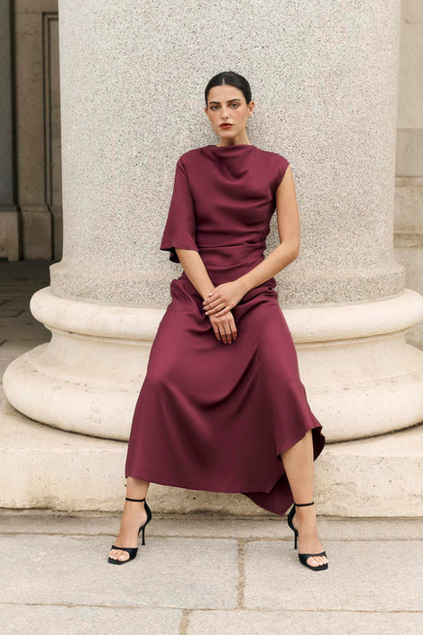 Este vestido Carmina, con su corte asimétrico y cremallera trasera, ofrece un diseño sofisticado y elegante, ideal para cualquier evento otoñal. Su silueta única realza la figura y aporta un toque distintivo, perfecto para destacar con estilo en ocasiones especiales.