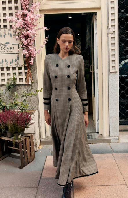 Este vestido de vuelo con botones delanteros y hombreras está diseñado para resaltar tu figura ajustándose a la cintura. Su estilo versátil te permite combinarlo con tacones para eventos de invierno o con botas para un look perfecto en la oficina. Elegancia y comodidad en una sola prenda para cualquier ocasión.